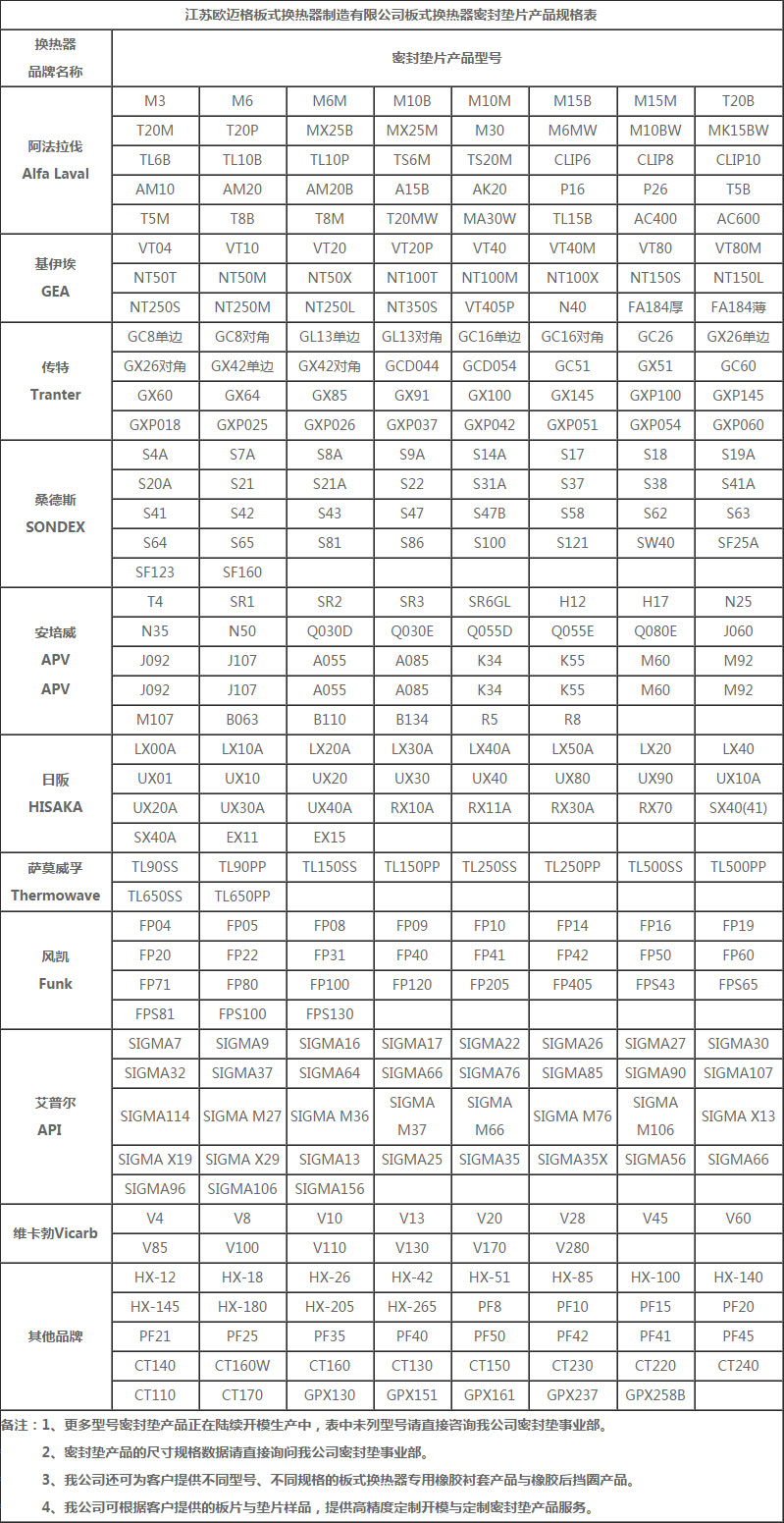 江蘇歐邁格板式換熱器制造有限公司國產板式換熱器密封墊片產品規格表