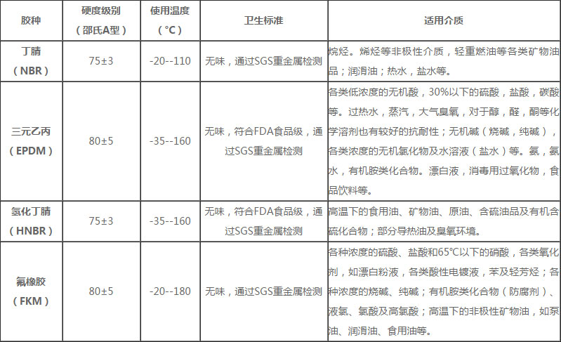 80±5 -35--160 無味,符合FDA食品級,通過SGS重金屬檢測 各類低濃度的無機酸,30%以下的硫酸,鹽酸,碳酸等。過熱水,蒸汽,大氣臭氧,對于醇,醛,酮等化學溶劑也有較好的抗耐性;無機堿(燒堿,純堿),各類濃度的無機氯化物及水溶液(鹽水)等。氨,氨水,有機胺類化合物。漂白液,消毒用過氧化物,食品飲料等。