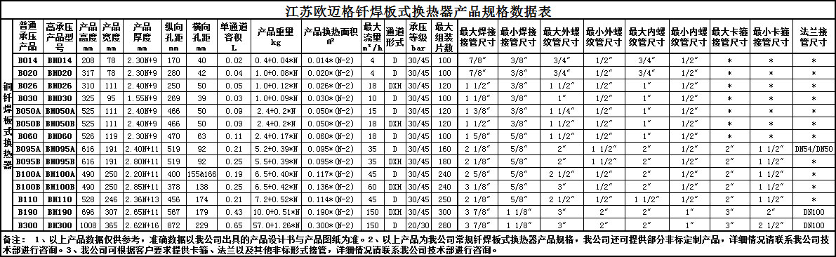 江蘇歐邁格釬焊板式換熱器產品規格數據表